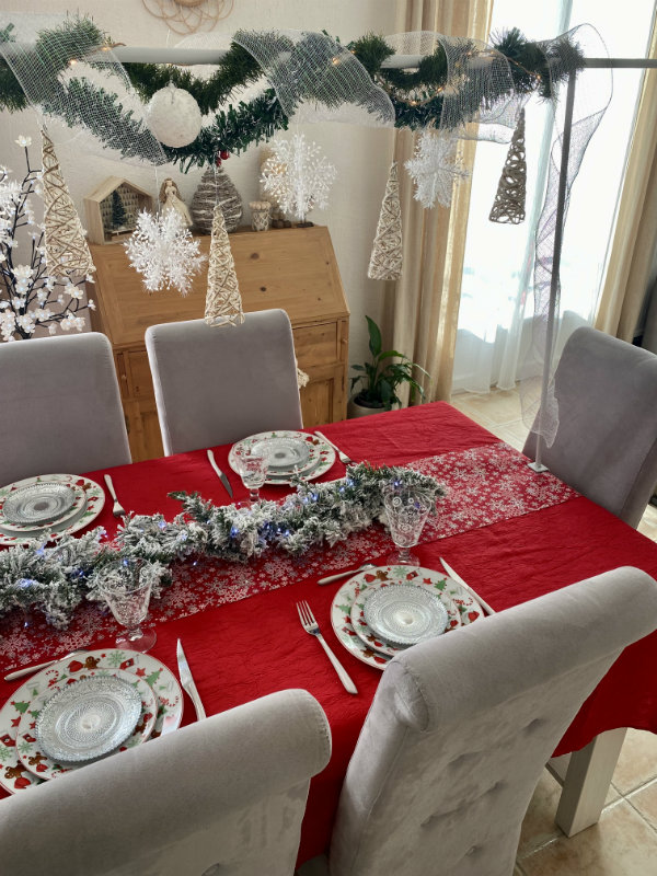 Je suis donc partie sur une nappe rouge un peu épaisse en matière type « velours », un chemin de table fin et un deuxième style « forêt enneigé » par-dessus pour relever le tout. J’ai ajouté une guirlande lumineuse discrète pour finir, ça fait toujours son petit effet !